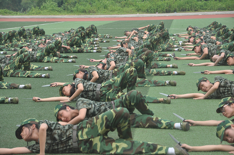 在军训场地上,不断传来铿锵有力喊“杀”声,一群手持 "利刃"的女生格外抢眼。每位女生手中都握着一把银晃晃的"匕首",进行着训练。“杀!”伴随着一声清亮的口号,她们右脚原地用力下踏,左脚向右大跨弓步,同时迅速向左转身,左臂向上化掌格挡在胸前,持匕首的右手挥刀猛力向前刺出,一招一式颇有章法。队列动作整齐划一,她们昂头收颌,目视前方,眼神坚定,英气十足。